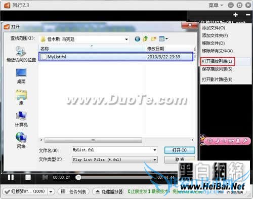4、使用播放列表文件时,在“播放列表”窗格中,用鼠标右键单击视频文件,选择快捷菜单中的“打开播放列表”命令,在“打开”对话框中找到保存 播放列表文件的文件夹(例如“F:佳木斯 马宪廷”),选择“MyList.fsl”文件(图3),单击“打开”按钮,即可将需要播放的多集电视连续剧添加到风行的播放列表中。在列表中双击最上面 的一个文件,即可播放该集电视剧,当看完该集后,电脑将自动播放后面的部分。