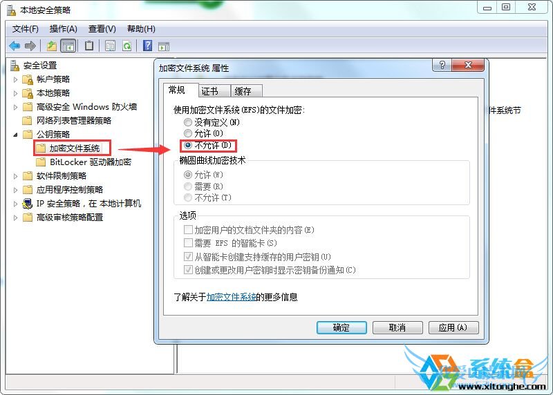 3、 在“常规”标签页中,将“使用加密文件系统的文件加密”设置为“不允许”,再按“确定”保存设置。