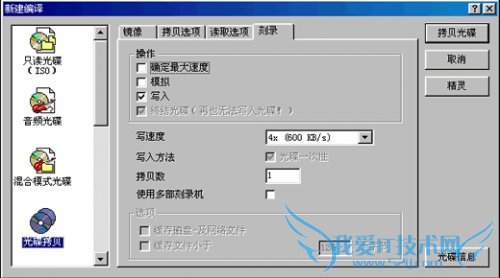 “新建编译”中选择“光碟拷贝”,在“拷贝选项”中取消“飞机式”复制模式,再到“镜像”中取消“光碟拷贝后删除镜像文件”,在“刻录”选项卡中只勾选 “确定最大速度”、“终结光碟”,这时“拷贝光碟”按钮会变为“速度测试”按钮。点击该按钮即可开始测试速度,当测试完毕就消取剩下的进度,这样我们所需要的光碟影像文件就在你硬盘上了。