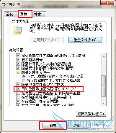 2.在打开的文件夹选项窗口中,切换到“查看”项,在“高级设置”框中,去掉“用彩色显示加密或压缩的NTFS文件”前面的钩,最后点击确定保存即可恢复成黑色。如下图所示