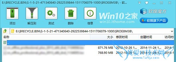 双击这些文件夹,系统无情的提示你“别动我,你没权限!”。小样,这能难倒我?赶快拿出咱家的魔方压缩(点此下载)(要用管理员身份打开哦),然后在魔方压缩里面打开回收站的每个文件夹挨个看个究竟。果不其然,在其中的一个文件夹中真得发现了两个大家伙,而且两个家伙占用的空间和丢失的空间基本一致,看下图,为了保护个人隐私文件名就打上马赛克啦。