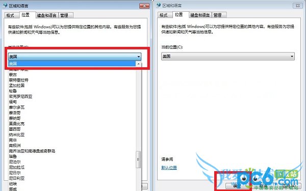 四、最后我们将下面的“当前位置”选择为我们需要的区域即可,比如要变成英文,我们可以选择区域为美国或者英国等,采用英语方言的地区即可,完成后点击底部的“确定”即可设置完毕,如下图所示: