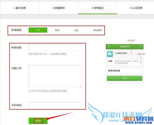 5、现在需输入来往公众平台的名称,功能介绍,手机号码,【继续】