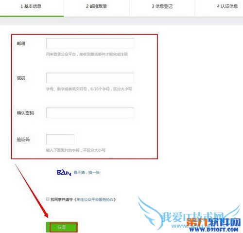 2、输入你的邮箱地址,还有来往公众平台登陆密码。【注册】