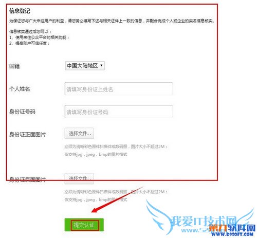 6、信息登记,需要你的身份证正反面的扫描图片,准备好哦!【提交认证】。