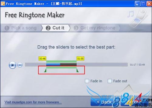 当音频文件添加到Free Ringtone Maker主窗口以后,用户可以通过拖动音频播放进度条下方的的滑块来设置截取的音频片段,单击“播放”按钮试听一下效果,Free Ringtone Maker还为用户提供淡入淡出功能,勾选“Fade in或Fade out”按钮即可添加淡入淡出效果;设置完成以后单击“Next”按钮进入下一步操作。