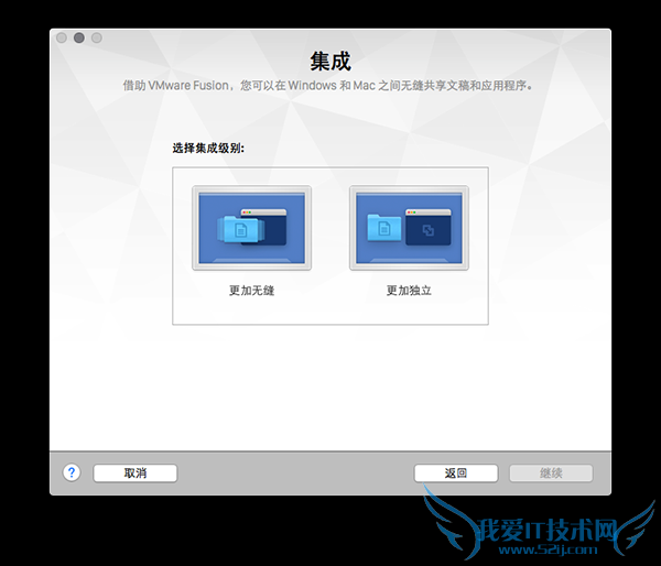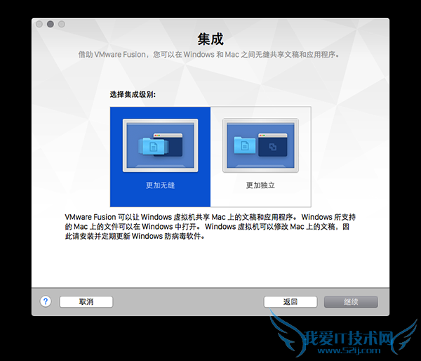 5、选择集成级别,决定是否与虚拟机系统共享Mac下的文件与应用程序,推荐选择更加无缝: