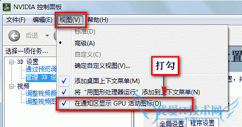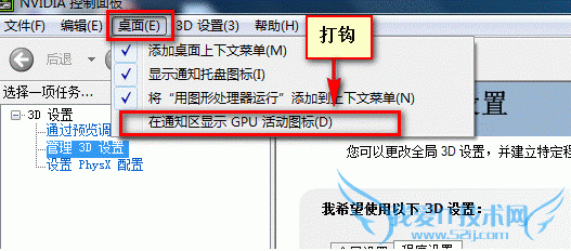 2. 菜单中选择“桌面”,勾选“在通知区显示GPU活动图标”;