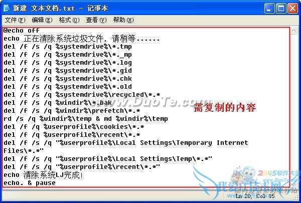 在你所建立的记事本中,复制粘贴下面的文字,如图一: