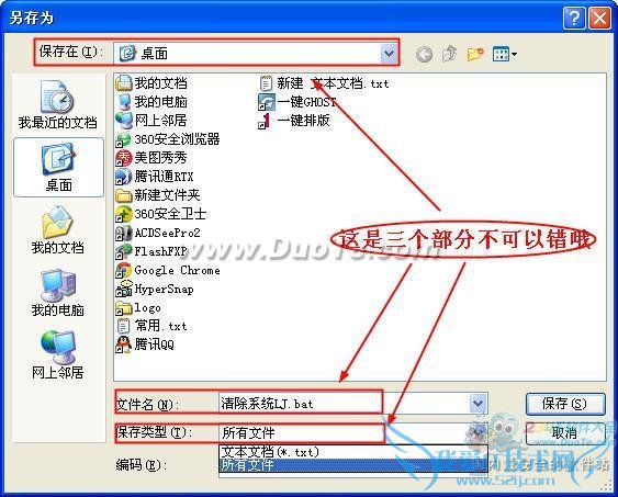 点击记事本上方的“文件”选项→“另存为”→选择“保存在”桌面→“文件名”改为“清除系统LJ.bat”→“保存类型”选择“所有文件”→点击“保存”。这样就OK啦,记住前面的修改信息一定不可以错,而且文件名的后缀一定要是“.bat”。
