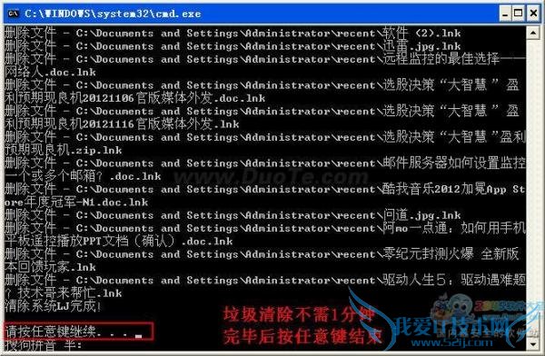 双击你做出来的电脑垃圾清除系统,清理电脑垃圾,只需要不到1分钟就可以快速清除你电脑里面的垃圾文件,清理结束后根据系统提示按任意键结束清理。一个小小的清扫系统既节省时间又保证电脑运行不受垃圾文件的干扰,是不是很心动,自己动手试一试吧!