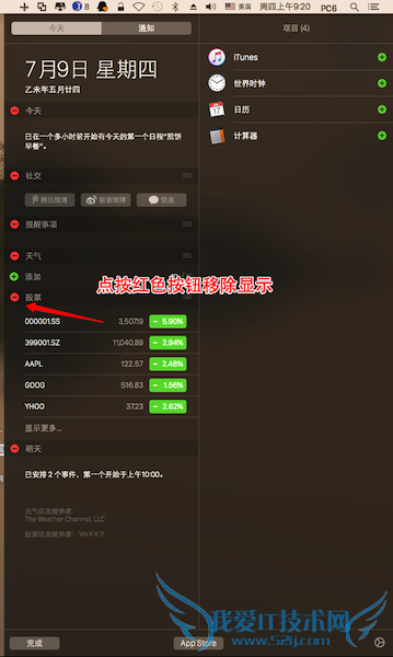 第二步、使用鼠标点按自己不希望显示的项目左侧的红色按钮,就可以移除这个项目的显示,然后点击底部“完成”相关项目就不会再“今天”界面显示了