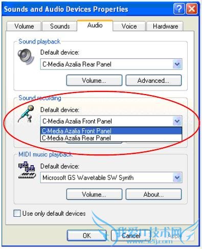 使用目前3针脚麦克插座的机箱,麦克插座就不能插立体声音箱,只能插耳麦。当使用前置麦克时需要通过软件设置。请到Sounds and Audio Devices Properties对话框的Sound recording部分。此项的默认设置是C-Media Azalia Rear Panel,把它切换到C-Media Azalia Front Panel即可。