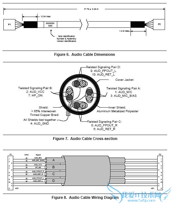 英特尔规范中对前置音频线也作了规定:左右声道、麦克以及AUD_VCC/HP_ON都要成对屏蔽,同时这些线还要组合在一起外层屏蔽。参考下图: