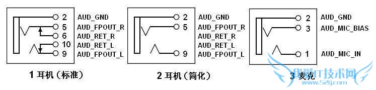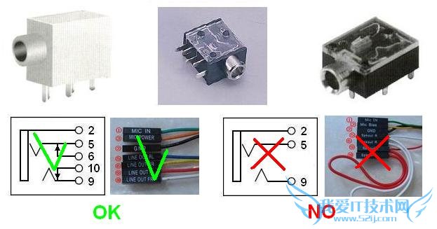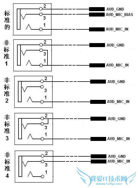 标准的接线有三条线:地线、麦克输入、麦克偏置。非标准的有二条线:地线和麦克输入,把麦克偏置省了。非标准1是把插座1、3短接,非标准2是3脚空着。这两种的把MIC_IN接到JAUD1的1脚是可以使用的。非标准3是把2、3短接,非标准4是把MIC_IN接到3脚,这两种插入标准插头的麦克肯定是没有声音的,除非也用那种与之相对应接法的非标准插头的麦克。