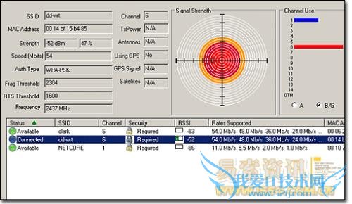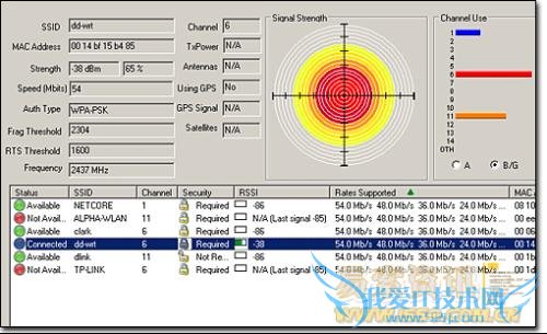 通过WirelessMon软件,我们首先可以看到当前无线网络的信号强度(雷达式),以及当前最拥挤的无线信道(例如图中是信道6)。此外,我们还可以看到所有无线热点的网络状态(是否可用)、网络名称(SSID)、所用信道、是否加密、信号强度、无线速率、以及MAC地址等信息。遗憾的是,WirelessMon会把某些300M无线网络识别成54M无线网络,用户需要注意这一点。