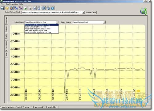 除了上面提到的无线信号扫描功能外,wirelessmon还提供了信号强度检测、监测无线网络的传输速度与图标生成等功能,点主界面左侧的graphs,横坐标是时间坐标,而纵坐标可以由我们来选择参数,包括signal strength percentage,signal strength(DBM),received rate,sent rate,total data rate等等,以便让我们了解网络的下载速度或其稳定性。