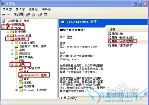 2 .然后在用户配置——管理模板——系统——CTRL+ALT+DELE选项,右侧找到“删除任务管理器”。