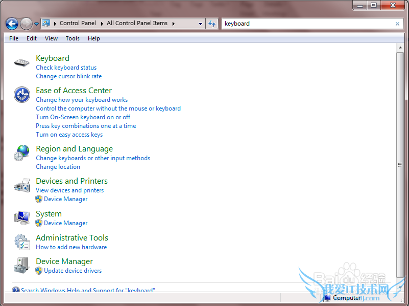 第一种办法(推荐),如果英文还算过关,您可以直接在控制面板右上角搜索框输入与功能相关的英文。(当然也可以直接输入“键盘”,只是输入英文的好处在于,无论您用的什么语言的操作系统,输入英文来查询总是有效的)