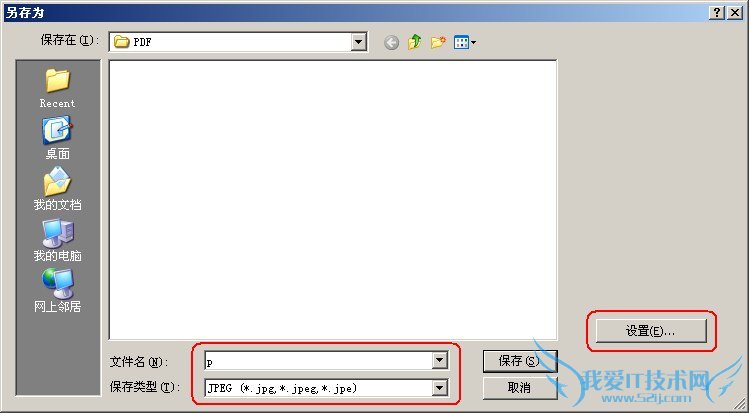 第 3 步:导出 JPEG 参数设置,在弹出的“另存为”对话框中输入文件名“p”,接着点击“设置”,再在弹出的参数对话框中,按照图中的示例设置参数: