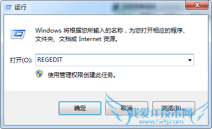 2、在打开的运行对话框中输入“REGEDIT”字符命令,按确定键;