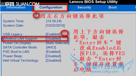 重启机器后连续按F2键进BIOS,Configuration页面Wireless LAN Support保证是Enabled状态,如果是Disabled状态如何更改,如下图: