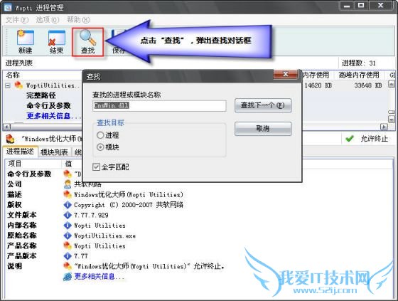 不同的进程可能包含有同一模块,更有甚者是个别恶意程序或病毒将自己的模块注入到了系统进程等其它进程中。例如:某插件将其存放在Downloaded Program Files目录下的CnsMin.dll注入了诸如IE等其它进程的空间。在上一版本的Windows进程管理中,用户虽然可以通过在模块列表中点击“发行商”来逐一检查进程是否已被注入,但依然不太方便。现在简单了,Wopti 进程管理大师向用户提供了强大的查找功能,用户可以方便地查找指定的模块存在于哪些进程中,例如:输入CnsMin.dll,不断点击“查找下一个”就可以便捷地找到自己系统上所有被注入了该模块的进程。