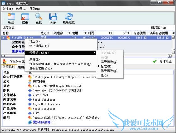 设置优先级:将设置选中进程的优先级,包括:实时、高、高于标准、标准、低于标准、低。备注:在“安全模式”下,Wopti 进程管理大师不允许将一个进程的优先级调整为实时和高。首先,大多数操作系统本身的进程优先级较实时低,如果一个进程得到的CPU时间比操作系统还多,易造成系统的崩溃。另外,也不要轻易将进程的优先级设置为高,因为,高优先级的进程会从低优先级的抢夺CPU时间,直到它处于空闲,而对于抢先式操作系统若不能合理安排优先级,是很容易崩溃的。