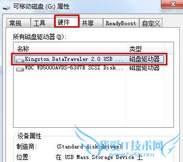 2.在打开的U盘属性窗口中,咱们将界面切换到硬件这一栏中,然后在下方的“所有磁盘驱动器”中选择U盘驱动器,之后再次点击下方的属性按钮。