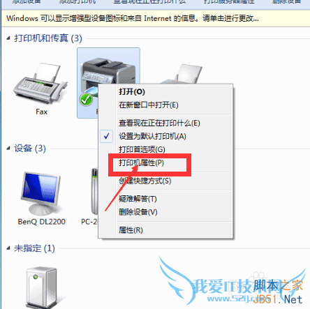 选中需要测试的打印机,右键点击找到打印机属性,点击进入