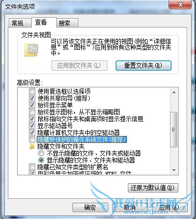 步骤三、然后打开了文件夹选项窗口,我们切换到“查看”窗口,然后在高级设置上取消“隐藏受保护的操作系统文件”前面的复选框;再选择下面的“显示隐藏的文件、文件夹和驱动器”选项,如图所示: