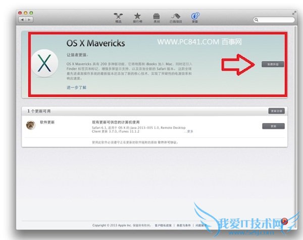 第二步:备份系统完成之后,我们进入App Store,然后找到苹果推送的免费OS X Mavericks升级信息,如下图: