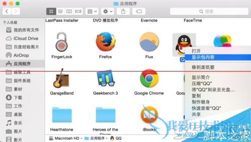 2、接着在应用程序目录里,找到 QQ 应用程序图标,点击右键并选择“显示包内容”选项。