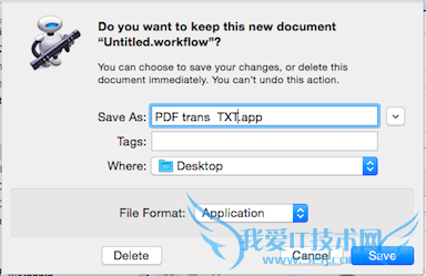 6、选择文件存储,注意文档格式选「 应用程序」,任意命名,默认保存到桌面(保存位置根据个人习惯选择),桌面上就会出现刚才建好的Macgg.app, 随意找个PDF文档拖入其中,是不是一秒钟就生成TXT了呢