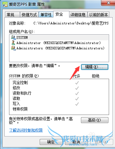 2、然后在属性对话框上方的菜单栏中找到安全选项,进入安全设置界面。然后点击用户列表右下方的编辑选项。