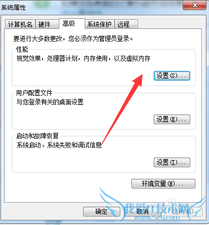 2、进入系统设置对话框在上方菜单栏选项高级选项,进入我们可以看到性能选项,点击后面的设置。