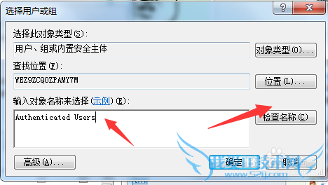 4、然后在输入对象名称来选择文本框内输入Authenticated Users,接着点击右方的检查名称开始检查。检查完成点击下方确定按钮,此时我们的Authenticated Users已经添加成功。问题解决。