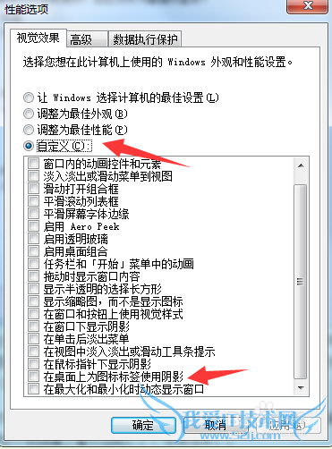 3、进入性能选项,选择视觉效果,然后点击下方的自定义选项,在下面列表中找到在桌面上为图标标签使用阴影前面打勾即可