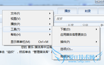 步骤二、在打开的Windows Medie Player播放器中,在菜单栏的空白位置处右键选择“工具”——“选项”。