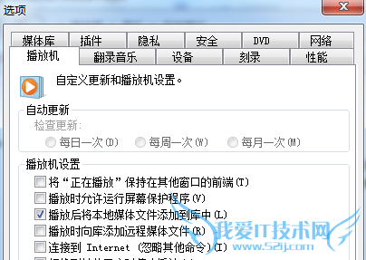 步骤四、把“选项”窗口切换到“播放机”标签页中,把自动更新关闭或修改成每月一次,将“播放时允许运行屏幕保护程序”和“播放时向库添加远程媒体文件”两项前面的勾选去掉,点击“保存”即可。
