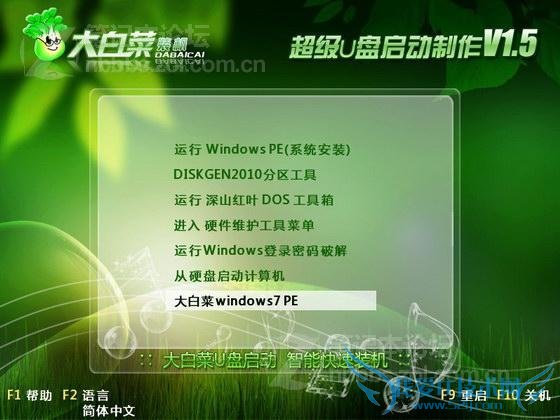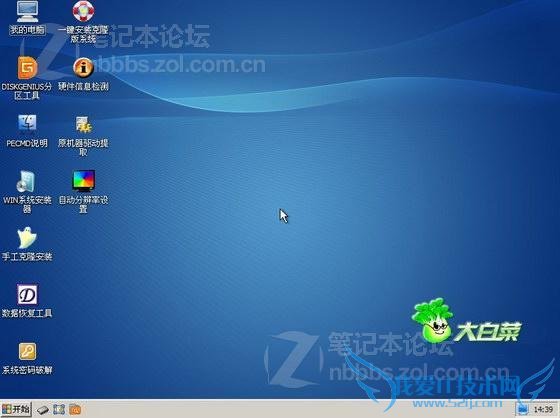 2、启动系统集成大白菜精心制作和改良的PE系统,真正可以识别众多不同硬盘驱动的PE系统,集成一键u盘装系统,硬盘数据恢复,密码破解,等等实用的程序。