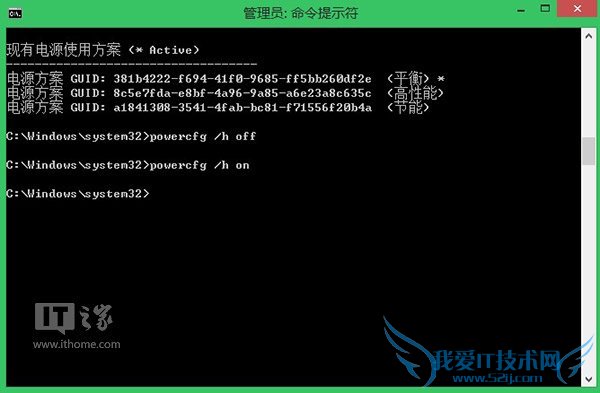 可以用powercfg /h on或者powercfg /h off的管理员:命令提示符进行开启或者关闭休眠。