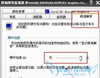 设置完成后单击“退出”,返回桌面,在桌面空白处右击,选择“属性”,打开“显示属性”,切换到“设置”选项卡,单击“高级”。然后在打开的对话框中切换到“疑难解答”,这里在“硬件加速”选项组中将硬件加速设置为“全”,单击“确定”。