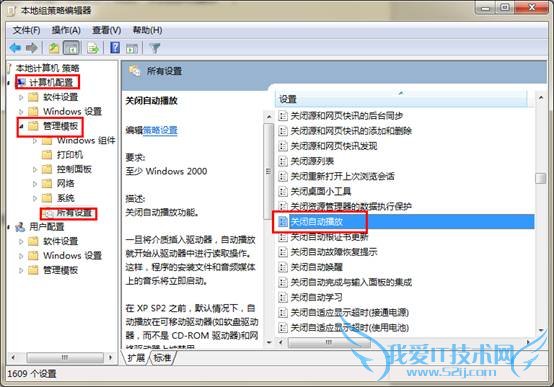 二、打开本地组策略编辑器后,在左窗格展开“计算机配置→管理模板→所有设置”,然后在右窗格的设置标题下,找到“关闭自动播放”。如下图所示: