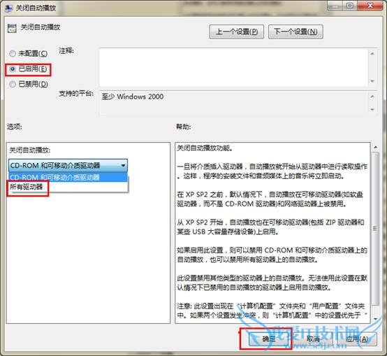 三、双击“关闭自动播放”,进入设置界面,选择择“已启用”,接着在下面的设置窗口选择“所以驱动器”点击“确定”即可。如下图所示: