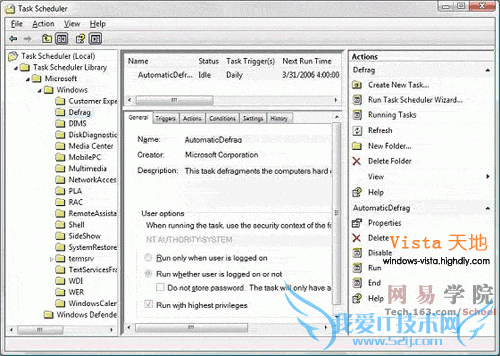 比如说,在Windows Vista中,周期性的硬盘碎片整理在默认安装中是自动的,这能够在相当程度上保证系统性能与健康状态。那么,这个自动运行的程序是如何设定的呢?我们可以在计划任务中查看它的设定细节,展开任务计划库(Task Scheduler Library)找到磁盘整理项即可看到相应的细节: