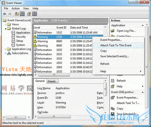 比如说,在事件查看器应用程序日志中ID为1530的事件为例,该事件说明注册文件未正确卸载,我们可以针对此事件创建一个新的计划任务:在事件查看器中的右键单击该项,选择“Attach Task To This Event”: