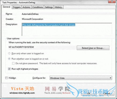 由上图可以看出,在默认安装设置中,硬盘碎片整理任务设定为无论用户登录与否均自动运行,当然,因磁盘碎片整理程序也是一个管理员级别的任务,在任务计划中它被设置为自动提升操作权限。