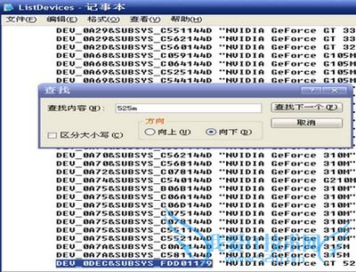 4、解压驱动文件到C盘,找到C:NVIDIADisplayDriver270.61WinXP InternationalDisplay.Driver文件夹内ListDevices.TXT,打开后搜索(ctrl+f)第一个 “NVIDIA GeForce GT 525M”修改前段文字“DEV_0DEC&SUBSYS_FDD01179”同硬件ID,如下图: