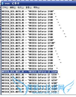 5、打开NVSM.INI文件搜索“525M”确认第一个为“NVIDIA_DEV.0DEC.01=“NVIDIA GeForce GT 525M””如下图: